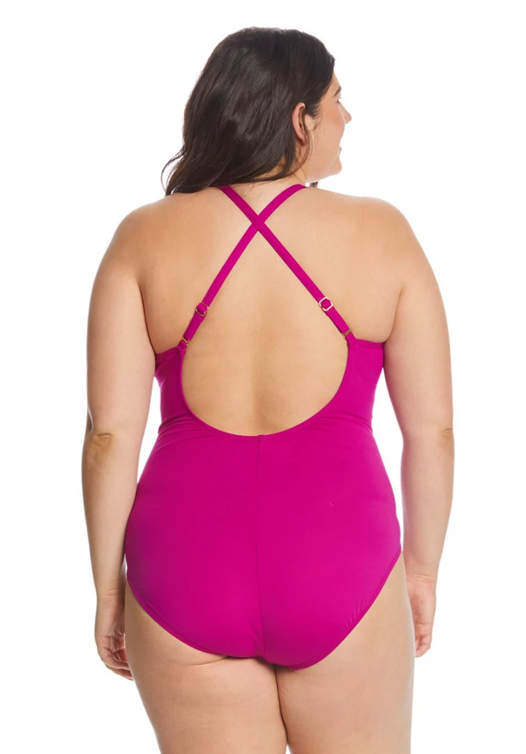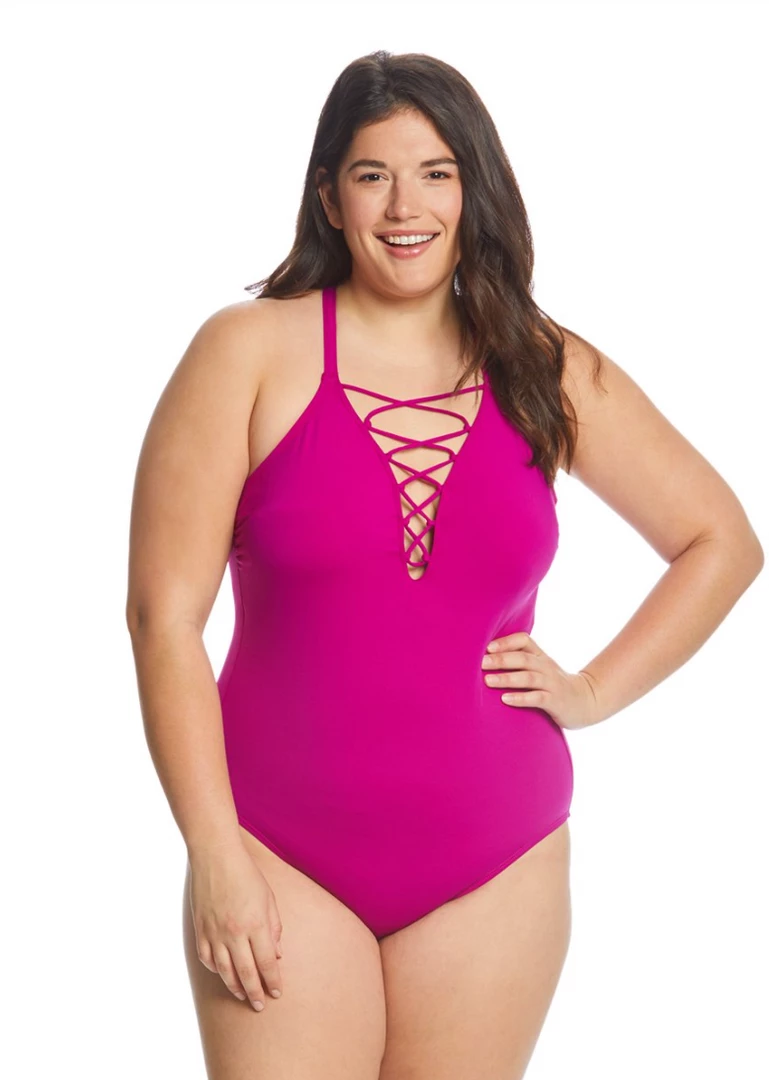 Our stylish new one piece is available in the most beautiful shade of magenta to flatter every skin tone. The pinky purple hue sets off the simple yet sexy design of this stunning one piece. Featuring adjustable straps, sewn in breast pads, a shelf bra and of course, the lace up detail, this swimsuit will have you standing out in style this summer.