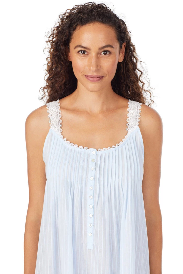 100% cotton with a delicate dobby stripe, this chemise is a clean and classic look, accented by venise lace at the straps and skirt, pintucks and a placket of akoya shell buttons.