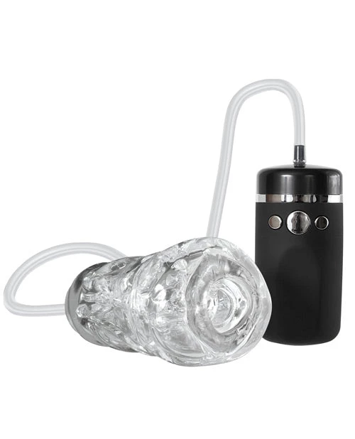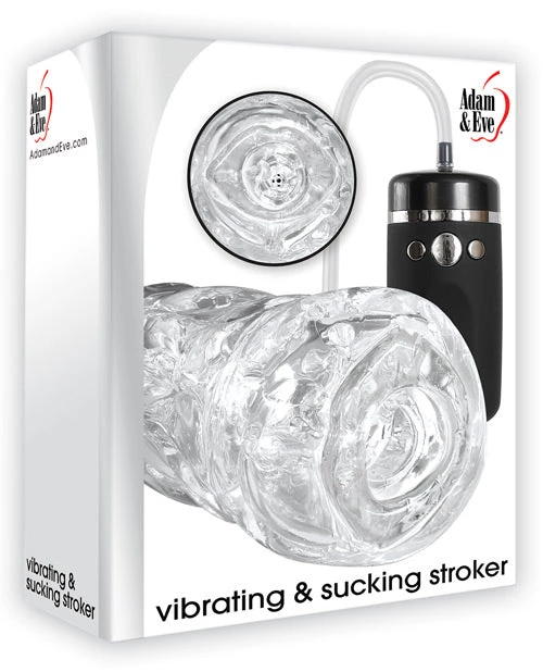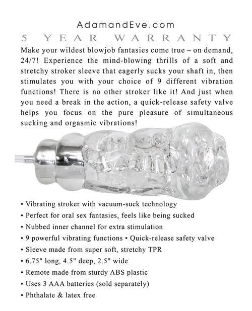 Make your wildest blowjob fantasies come true – on demand, 24/7! Experience the mind-blowing thrills of a soft and stretchy stroker sleeve with Adam and Eve’s Vibrating & Sucking Stroker. This stroker is perfect for oral sex fantasies since it feels just like being sucked. It sucks your shaft in, then stimulates you with your choice of 9 different vibrating functions, all features that can be controlled via it’s wired remote. The inner channel is also nubbed for extra stimulation. When you feel like you need a break from the action, you can use the quick-release safety valve. Requires 3 AAA batteries (not included) Length: 6.75 in (17.145 cm) Insertable length: 4.5 in. (11.43 cm) Width: 2.5 in. (6.35 cm) 5 year warranty.