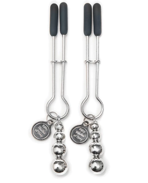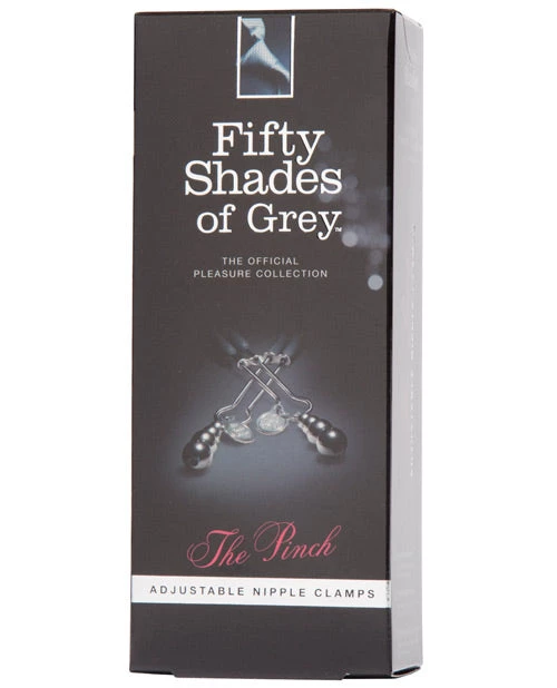 Fifty Shades of Grey The Pinch Nipple Clamps. Revel in the mid-ground between pleasure and pain as you lose yourself to the slowly-intensifying sensations of these weighted nipple clamps. Adjustable pressure grips you during wear to escalate your sensitivity until you beg for your erotic release. “These are for both pleasure and pain.” Christian murmurs. Christian releases the first clamp and then the other, causing my nipples to sing with a surge of sweet, sweet pain… but it’s oh-so good. – Christian Grey and Ana Steele. Firm-but-gentle, these adjustable clamps pinch the nipples with just the right amount of pressure to slowly build a warming sensitivity that blossoms into a titillating ache. Swaying from each tweezer clamp is a string of metal weights, causing further sensation to resonate through your nipples with every subtle movement. Soft silicone diffuses the severity of these clamps, offering a cushioned bite that allows pressure and movement to be the focus of your play. Full control is ensured courtesy of the adjustable fit of the clamps, so the pinch is never too much but always enough. The grip is easily adjusted during wear for instant release, or to further intensify your play. Ideal for use as part of progressive sensory play, your erotic response can be deepened by pulling on the weights or using a vibrator to send delicious shivers through your sensitized nipples. Part of the Fifty Shades of Grey The Official Pleasure Collection approved by author E L James. Complete with a Fifty Shades of Grey storage bag, these nipple clamps are the ideal erotic gift for fans of the trilogy.