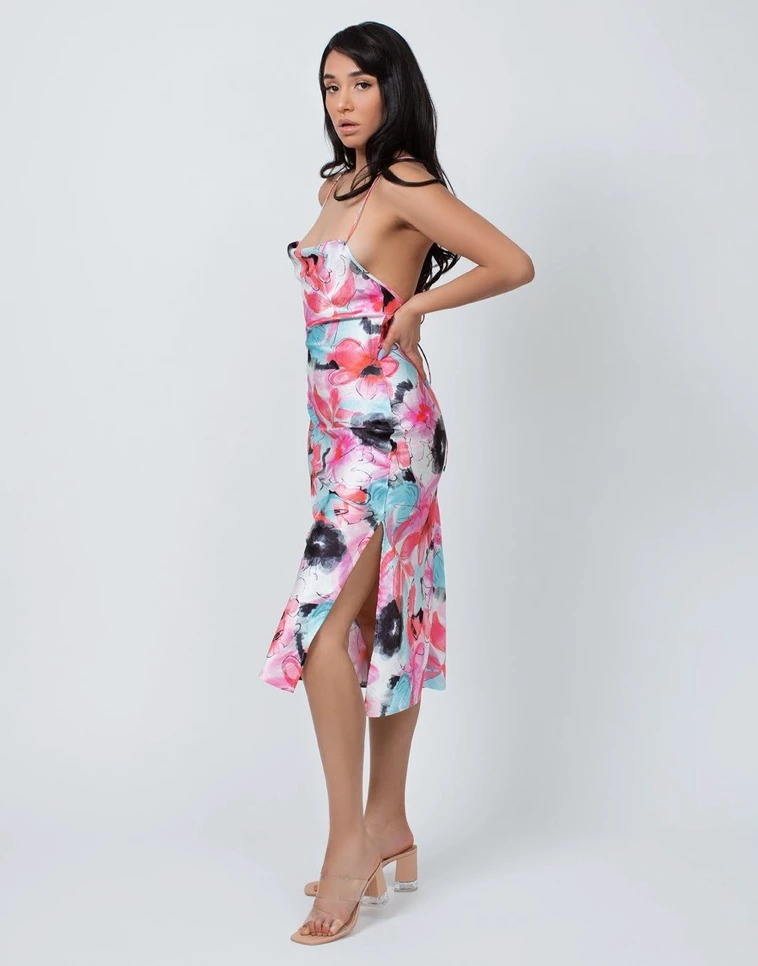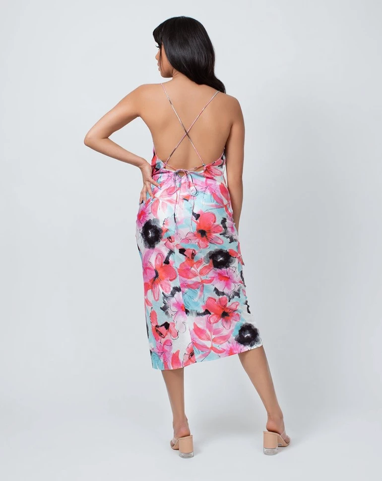 This slip is made for sleeping or lounging of course, but itโs also amazing dressed up with a pair of heels and some sparkly earrings. Midi length with slit on side. Super low back with criss-cross spaghetti straps, tie them where itโs comfortable. Cowl neck detail. Made with ultra soft satin jaquard fabric. Digitally printed with a hand-painted, retro floral print.