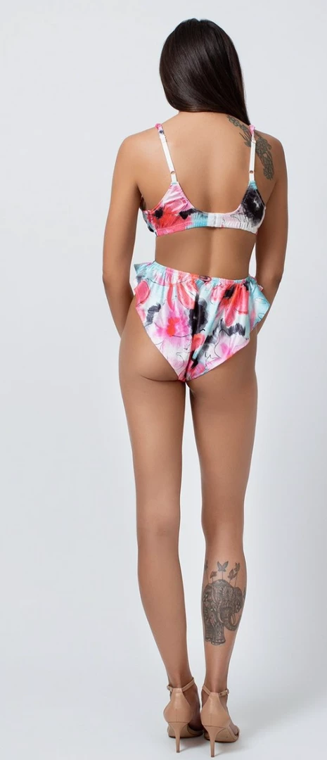 High waist and high leg silhouette with a flirty flare at waist thanks to it’s bias cut. Made with ultra soft satin jaquard fabric. Digitally printed with a hand-painted, retro floral print.