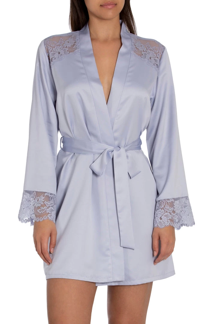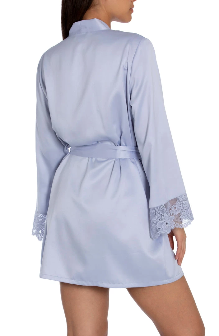 Kimono style sleeves. Flat band neckline. Beautiful lace detail on sleeve and shoulder. ย Self tie belt at waist.