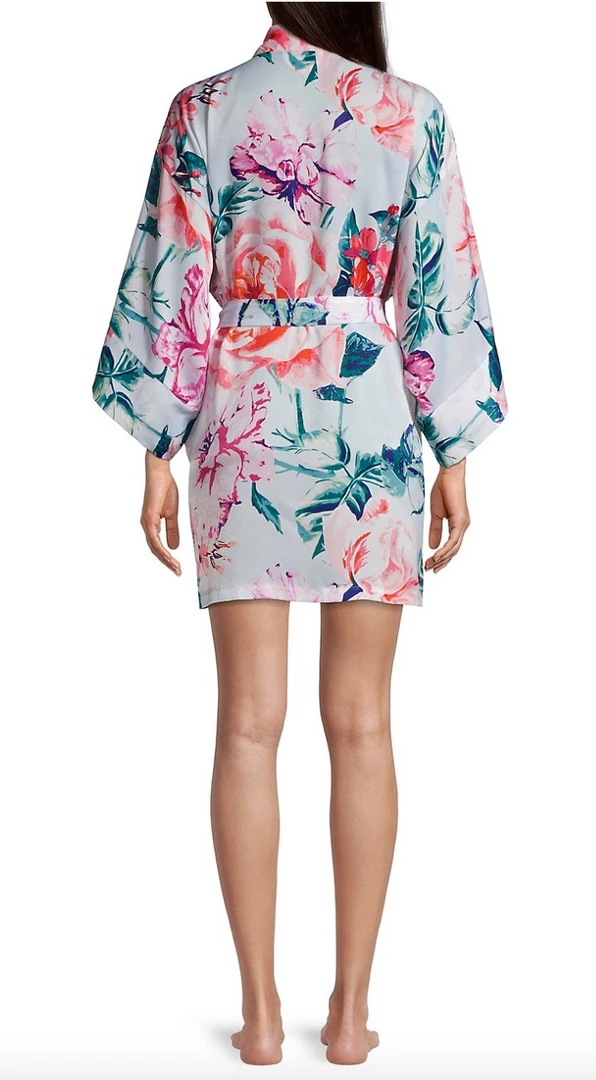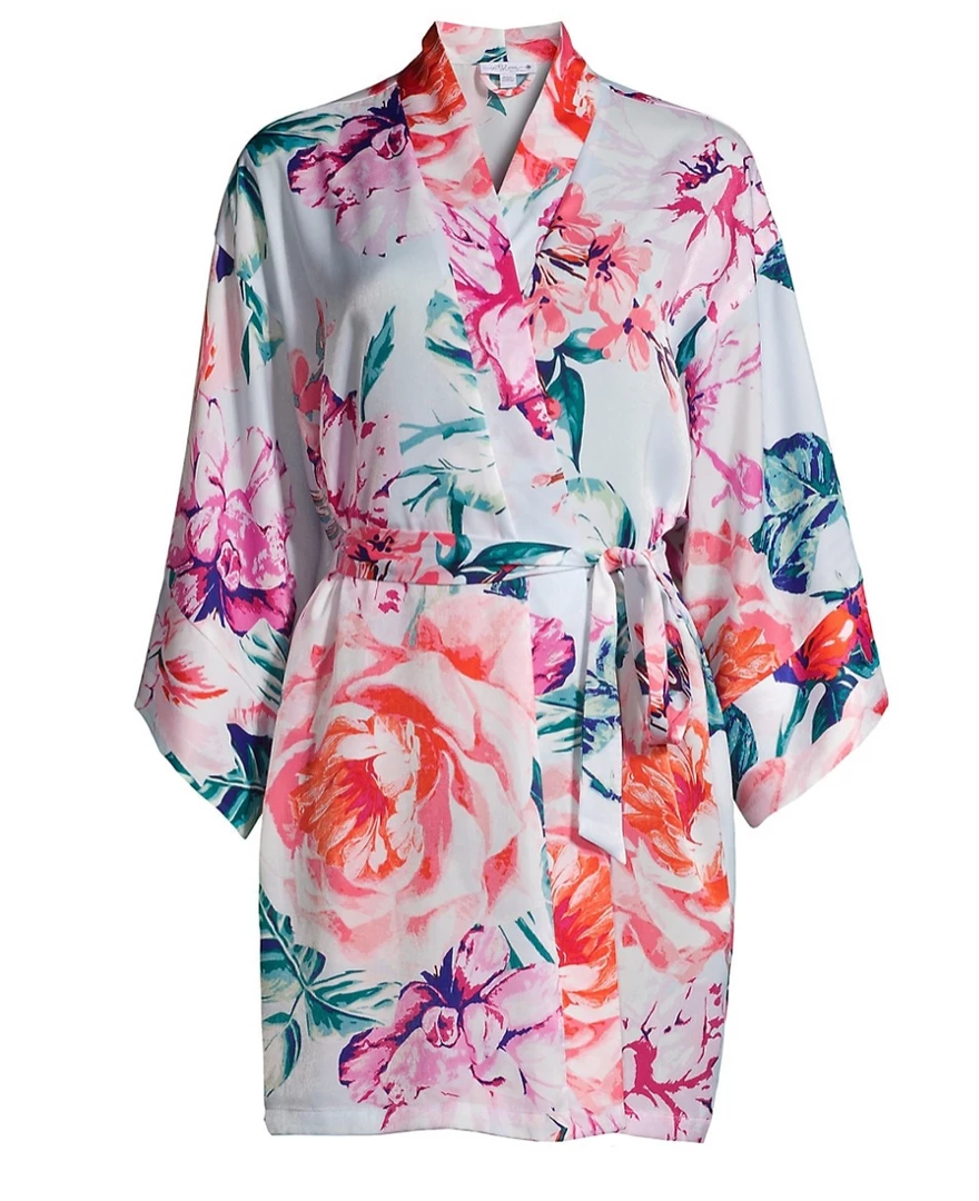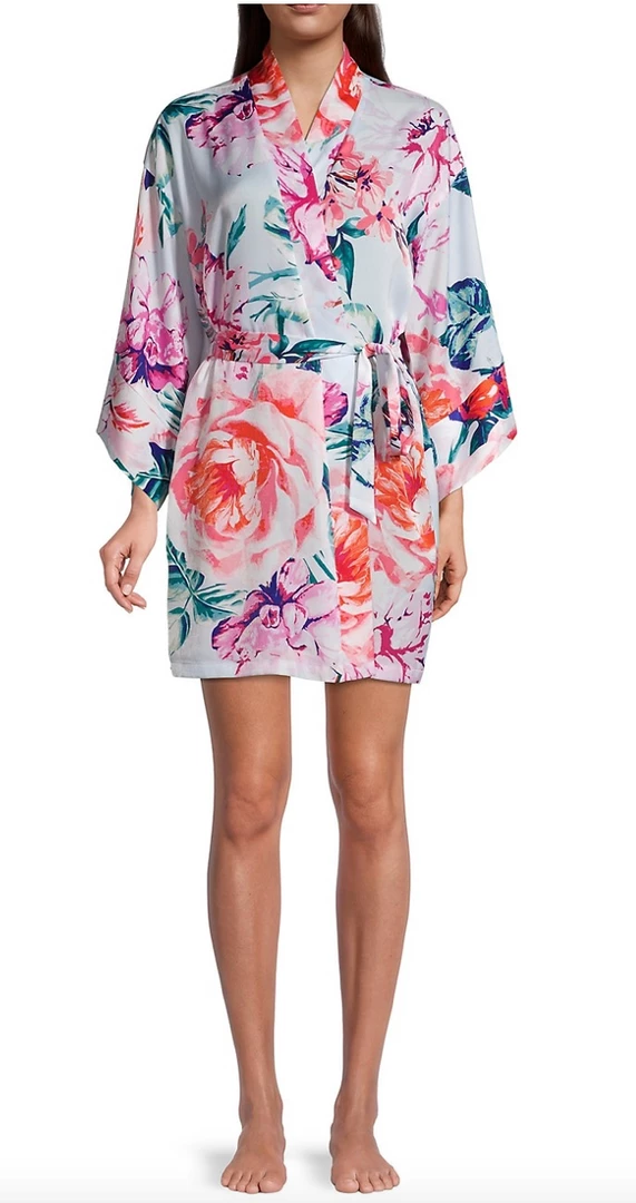 Vibrant floral print blooms on a shimmer satin wrap robe.