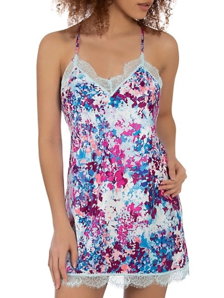 Impressionist inspired romantic floral print matte satin chemise with low V back and pale blue contrasting lace trim.