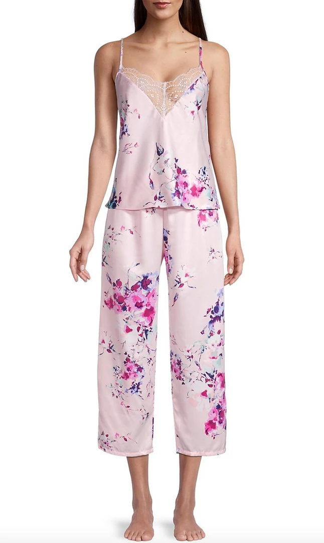 Floral pajama set including a lace-trim camisole and cropped, wide-leg pants. In Aqua & Pink.