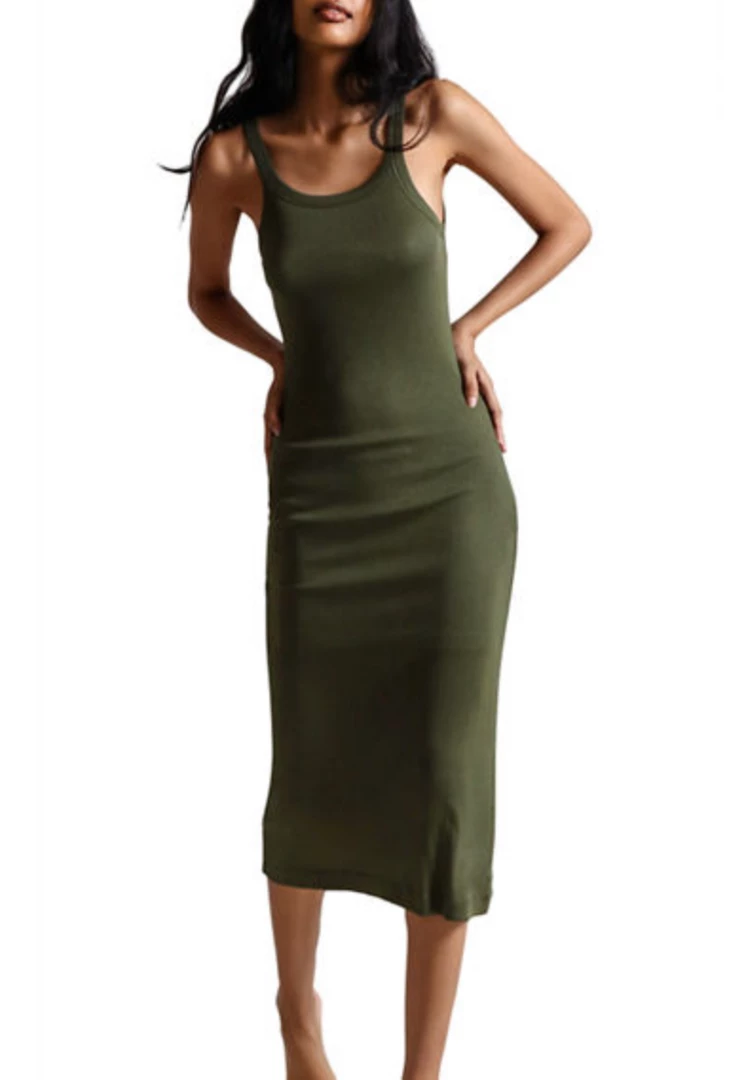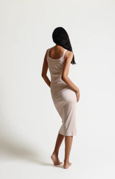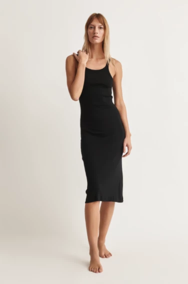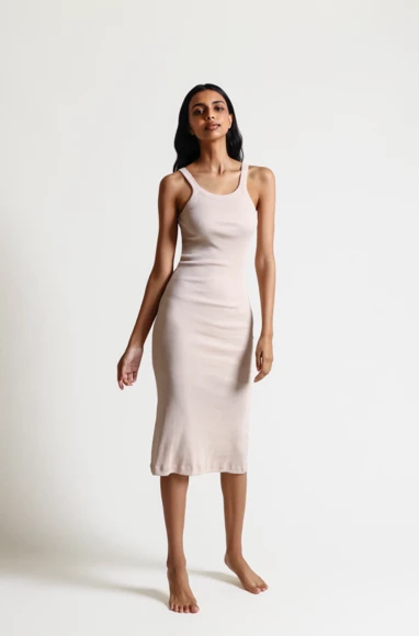 The Radika Chemise in ribbed Pima cotton is fitted and slightly higher cut in neckline. Double layered to mid-thigh. Easy to wear inside or out.