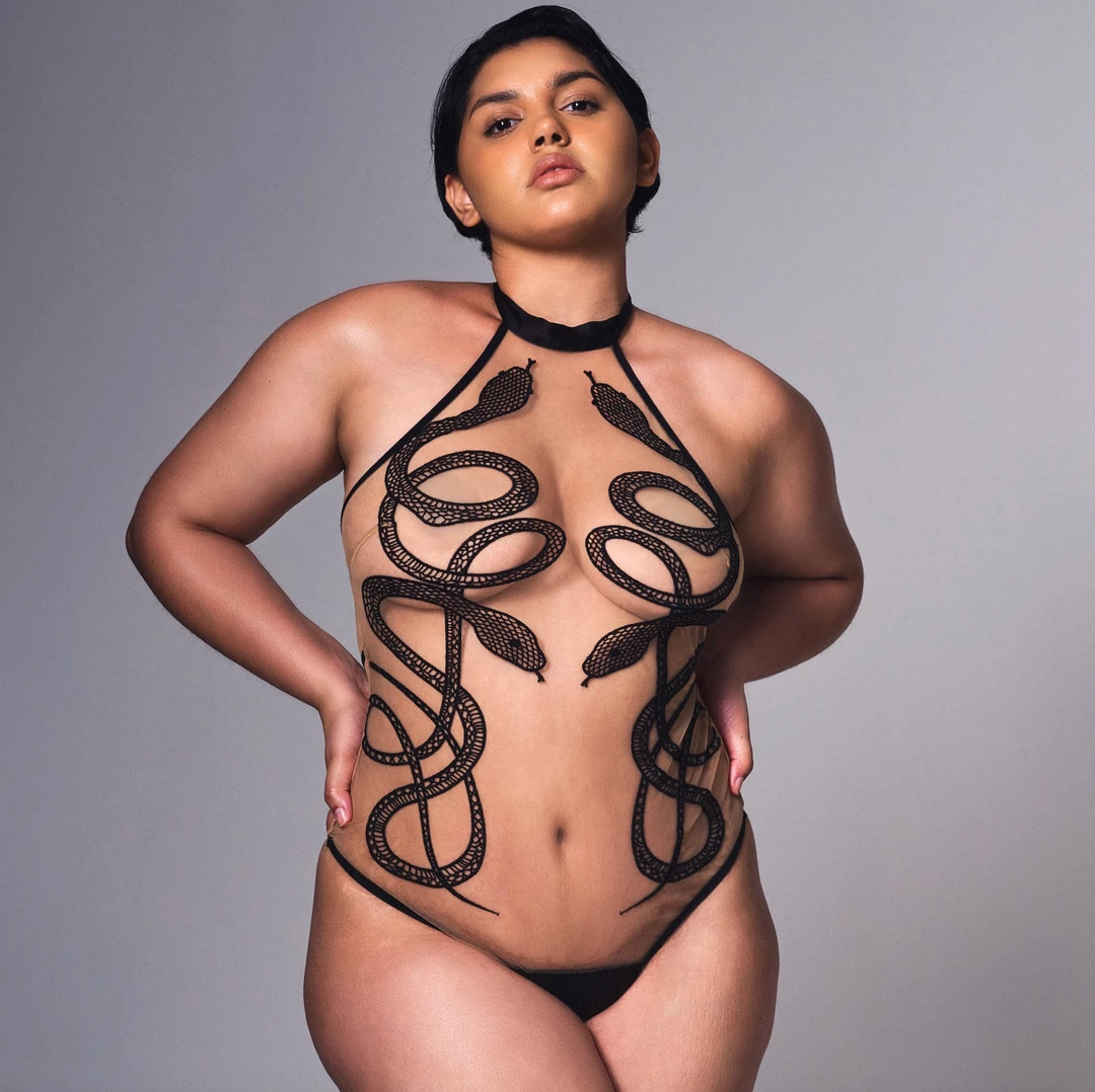 Tulle, halter neck style bodysuit with custom snake embroidery and finished into a mesh back.
