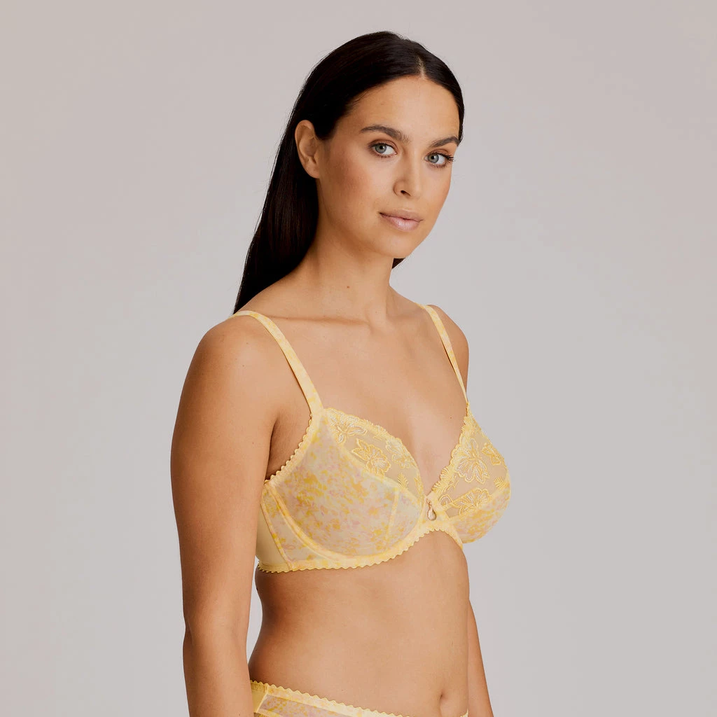 Feminine balcony bra made from printed voile and adorned with floral embroidery on the upper cups. The printed fabric continues onto the straps.